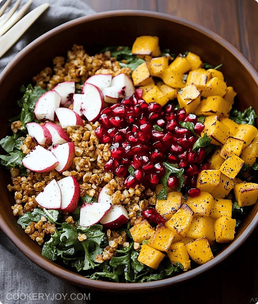 Time to bring it all together! Add the cooked quinoa to the bowl with the massaged kale. Toss them gently so they combine. Next, artfully arrange the roasted butternut squash on top. Sprinkle over the creamy goat cheese crumbles. Add the crunchy candied pecans. Don’t forget those jewel-like pomegranate seeds. They add a burst of color and flavor. If you have fresh parsley, sprinkle a little on top for garnish. Give it one last gentle toss. Serve your amazing Autumn Harvest Salad with Pomegranate right away. Enjoy every delicious bite!