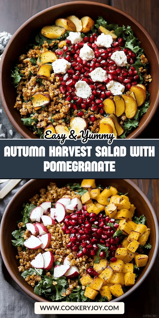 A vibrant and flavorful Autumn Harvest Salad featuring roasted butternut squash, fluffy quinoa, tender kale, creamy goat cheese, crunchy candied pecans, and juicy pomegranate seeds, all tossed in a tangy pomegranate molasses dressing.