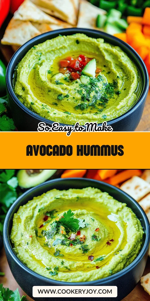 This delightful Avocado Hummus plays well with so many things! Serve it with warm, fluffy pita bread. Or, for a healthier crunch, grab some colorful vegetable sticks like carrots, celery, or bell peppers. It also makes a fantastic spread for sandwiches and wraps. Don’t forget to drizzle with extra virgin olive oil and sprinkle with paprika or cilantro for that extra special touch. It’s even great as a healthy side with grilled chicken or fish.
