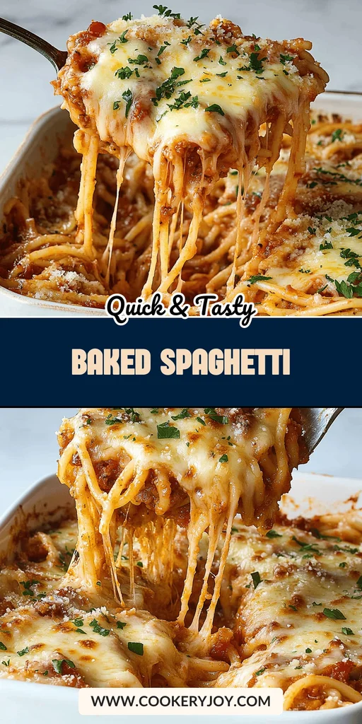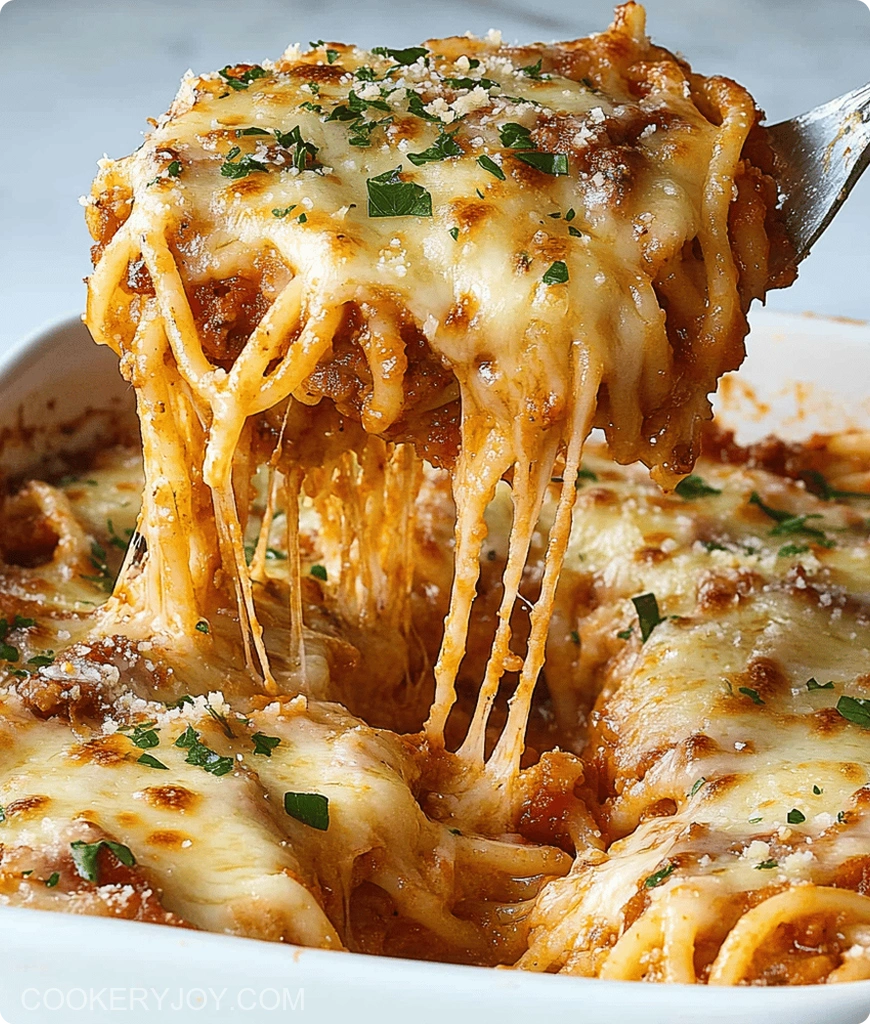 A classic and comforting baked spaghetti casserole featuring a rich meat sauce, tender pasta, and a generous blend of three cheeses, baked until bubbly and golden.