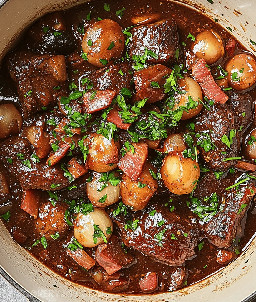 A classic French stew featuring tender beef braised in red wine with vegetables and bacon.