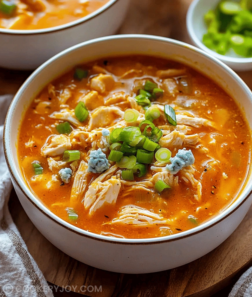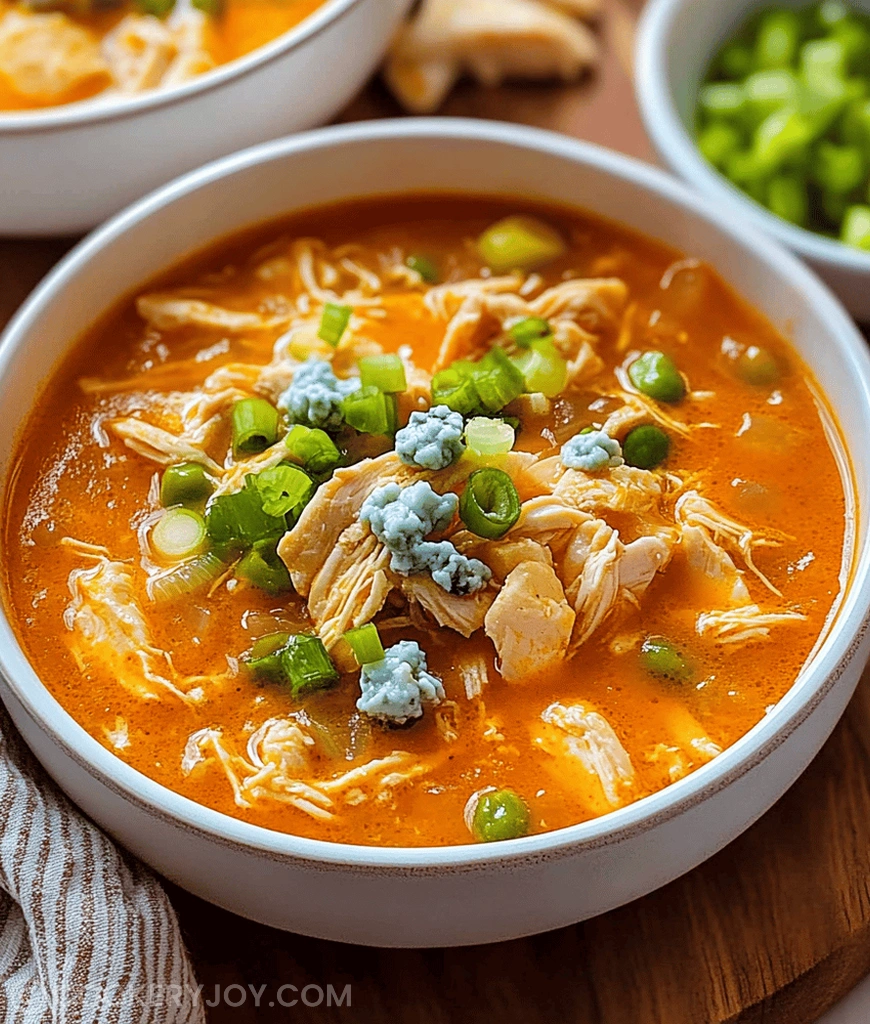 A creamy and zesty Buffalo Chicken Soup recipe featuring shredded chicken, vegetables, buffalo wing sauce, and blue cheese.