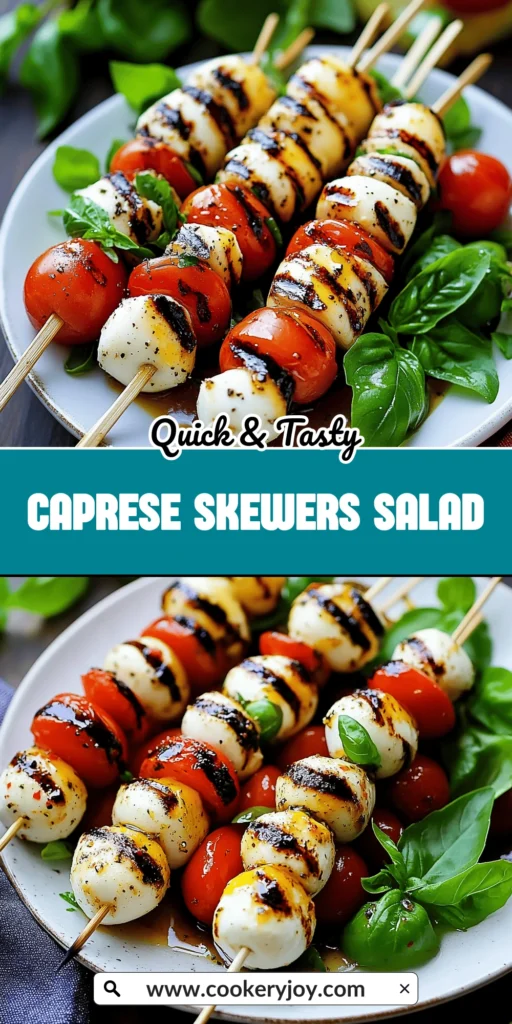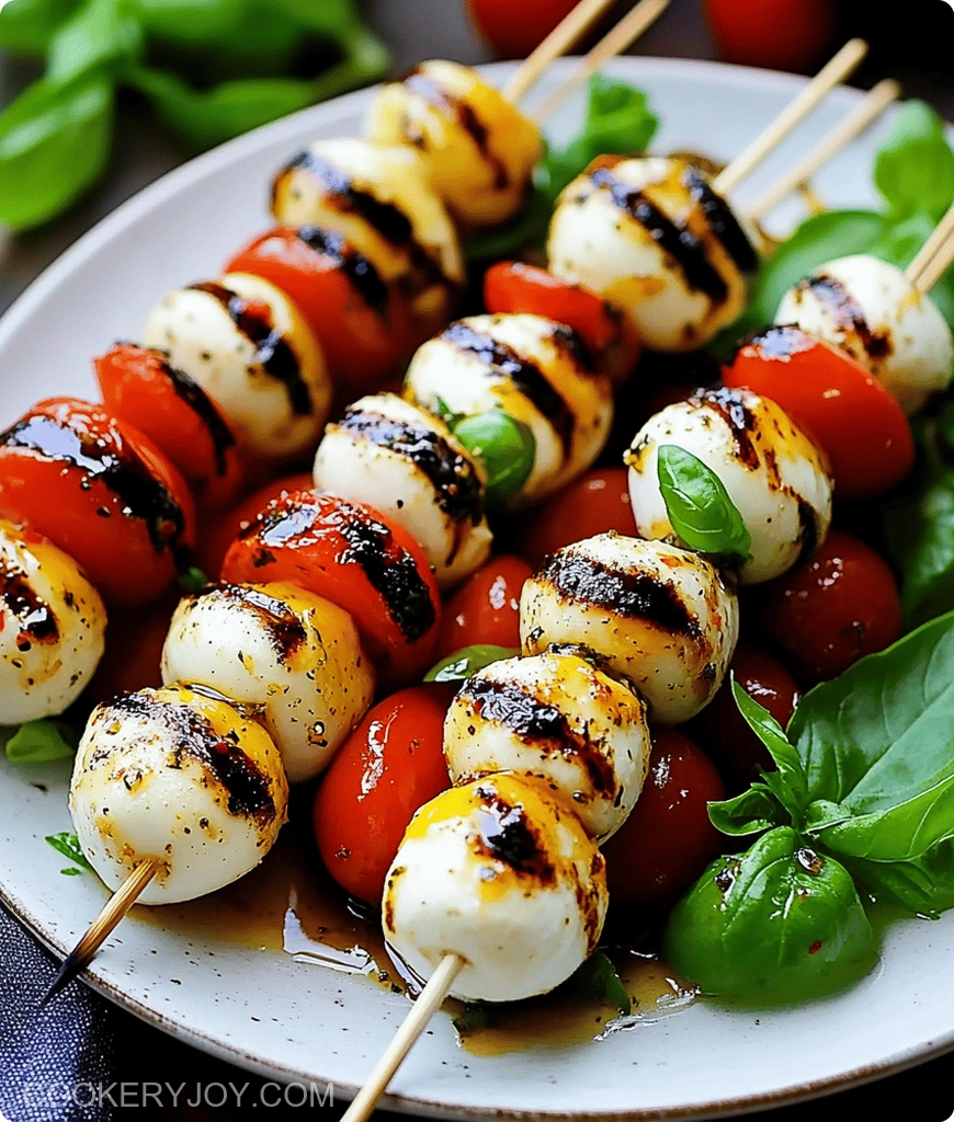 A simple and elegant Caprese skewers salad featuring fresh tomatoes, mozzarella, and basil, drizzled with olive oil and balsamic glaze.
