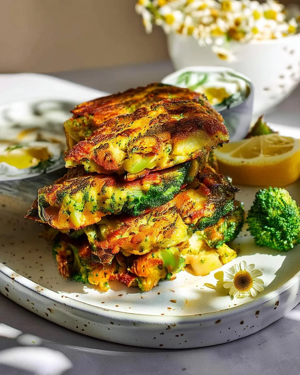 Crispy and cheesy broccoli fritters made with steamed broccoli florets, cheddar and mozzarella cheese, and seasoned with herbs and spices, perfect as a snack or side dish.