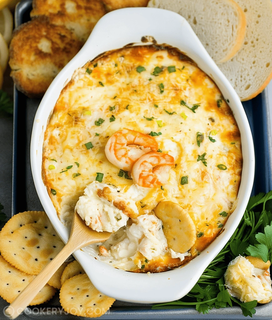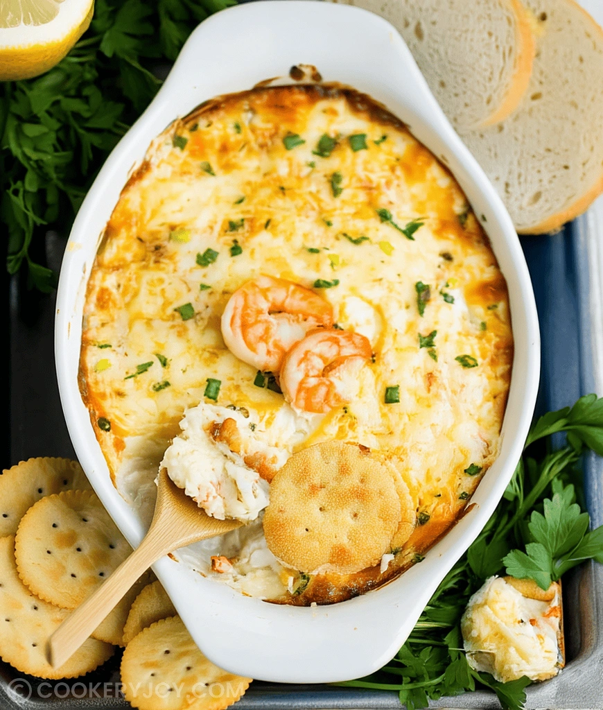Once ready, pull that amazing hot dip out carefully. Let it rest for just a tiny moment before serving. Serve the Cheesy Hot Shrimp Dip piping hot. Offer plenty of crispy crackers or tortilla chips alongside it for dipping pleasure.