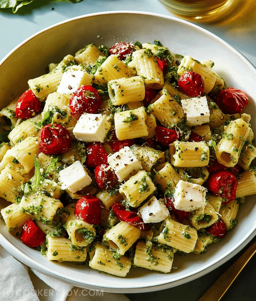A festive and colorful pasta salad featuring classic Christmas colors (red, white, and green) perfect for holiday gatherings.