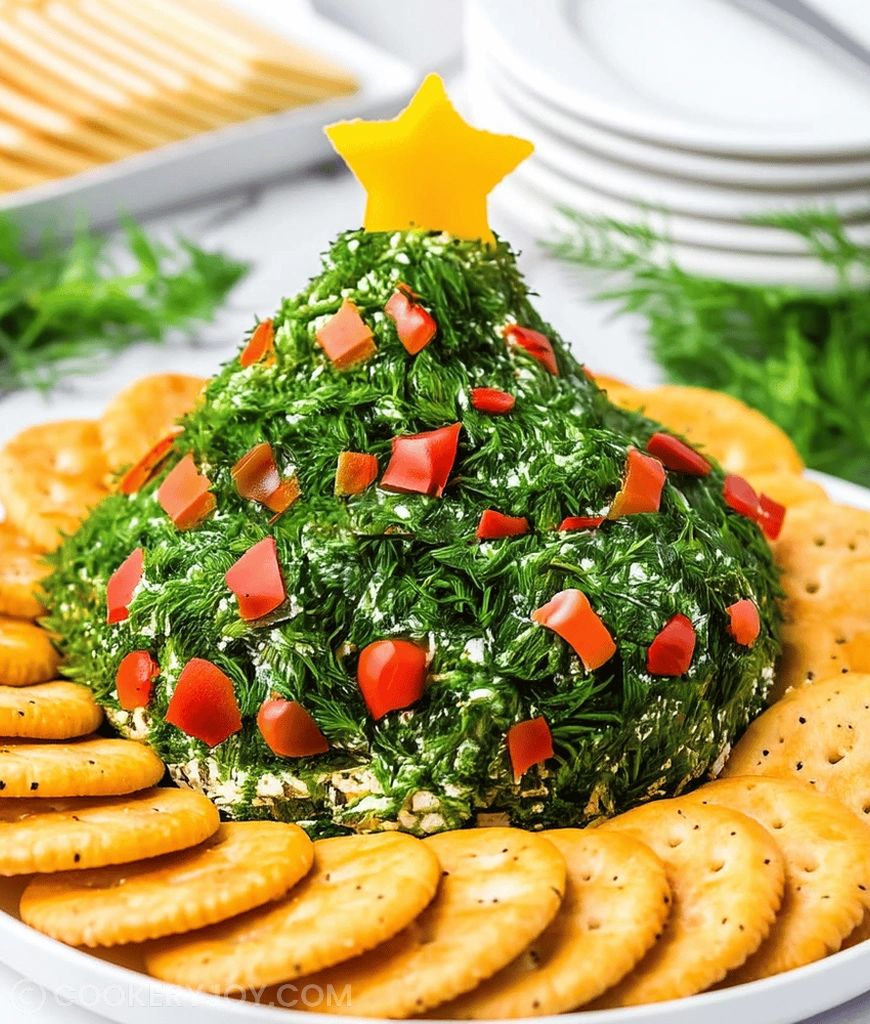 A festive and easy-to-make cheese ball shaped like a Christmas tree, perfect for holiday gatherings.