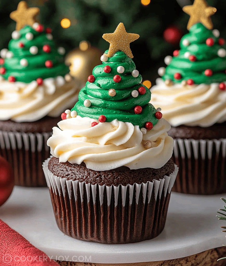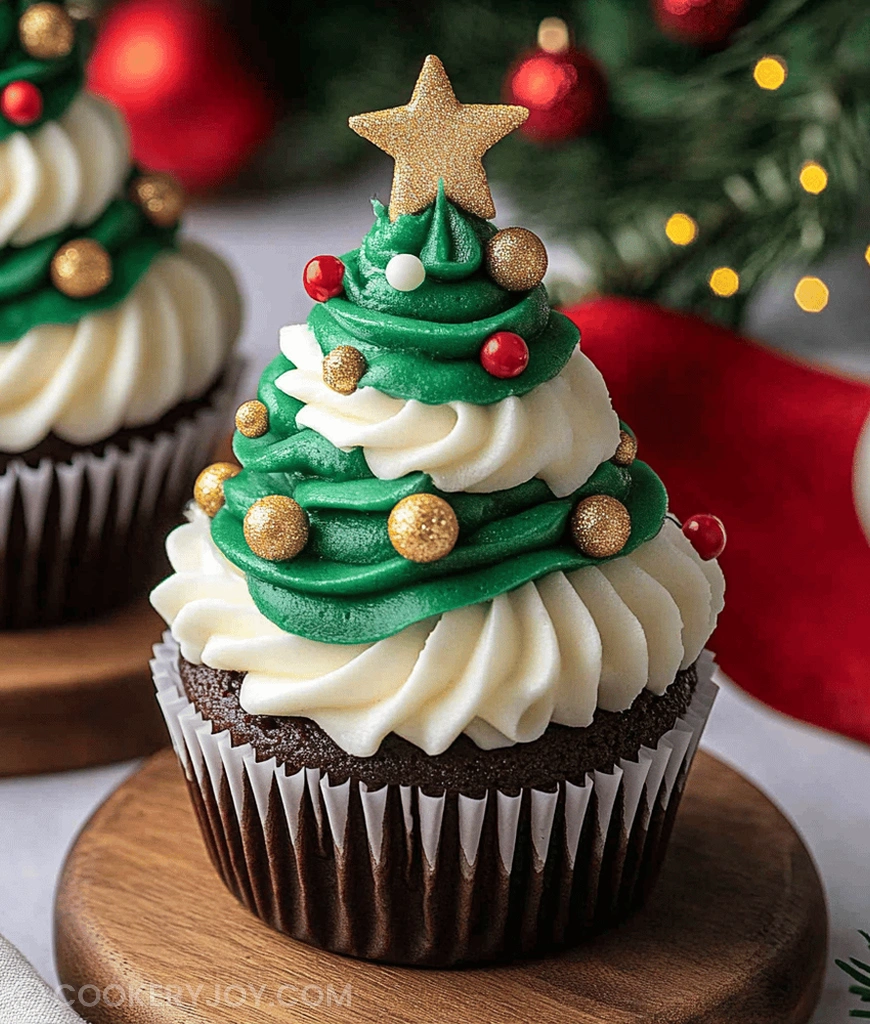 - Pipe the frosting onto each cooled cupcake in a spiraling motion, starting from the outside edge and working your way up to form a cone-like Christmas tree shape.