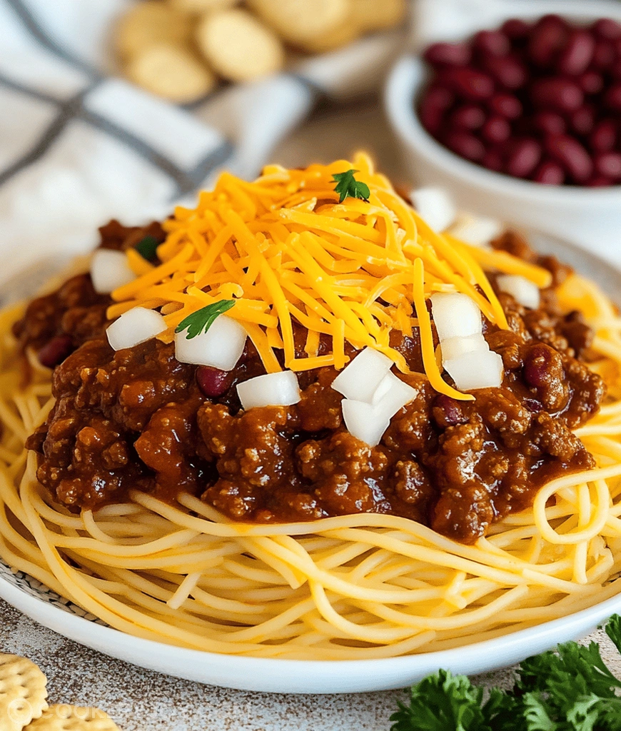 This is where the fun truly begins for this American comfort food! Place a good portion of spaghetti on each bowl. Spoon a generous amount of the rich chili right over the pasta. Then, pile on that finely shredded cheese mound, which makes the 3-Way Chili. Remember the topping rules for your perfect configuration.