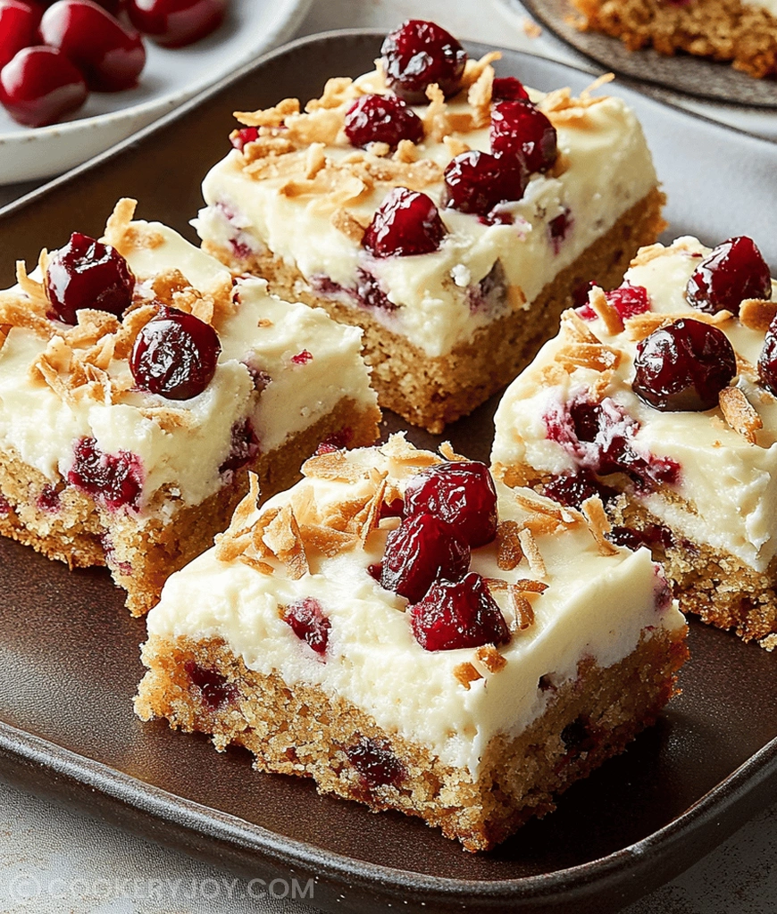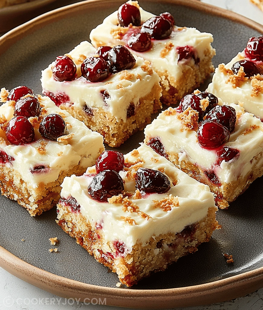 Once the blondie base is totally cold, spread the frosting. Cover the top edge-to-edge smoothly. Now, melt the remaining white chocolate carefully. Drizzle this melted chocolate over your frosted layer artfully. Sprinkle finely chopped residual dried cranberries right on top. Cover the entire thing and chill for half an hour. This helps the glaze set nicely. Carefully lift the whole slab out. Slice into those perfect triangles or squares.