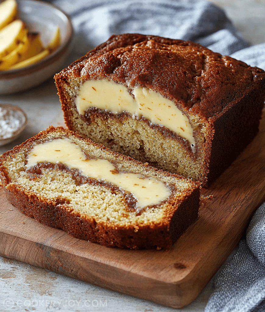 A moist and delicious banana bread recipe with a creamy cream cheese swirl throughout. Perfect for breakfast or a sweet treat.