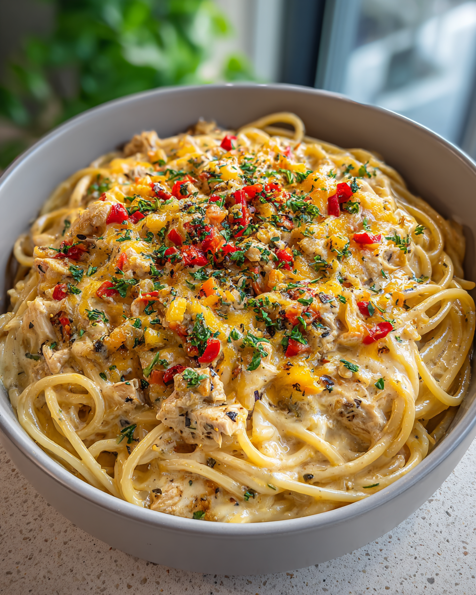A comforting, creamy casserole featuring spaghetti, tender chicken, Rotel tomatoes with green chilies, and a cheesy sauce, baked until bubbly and golden.