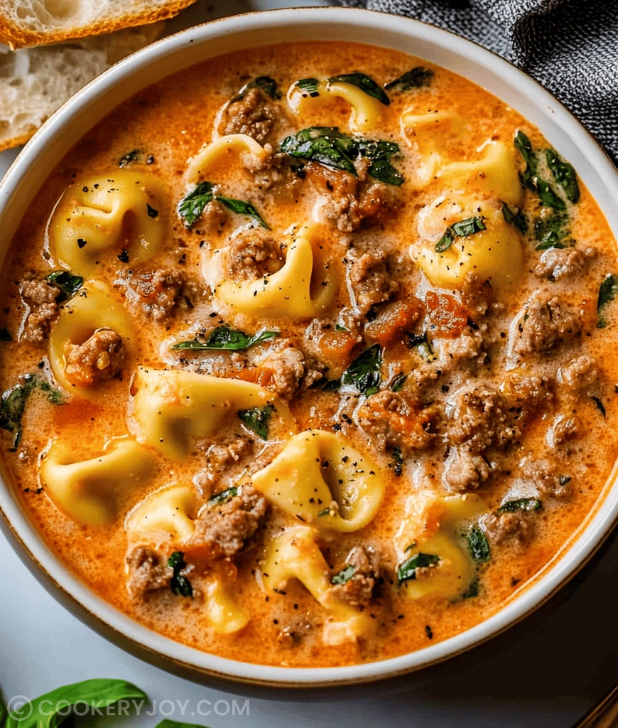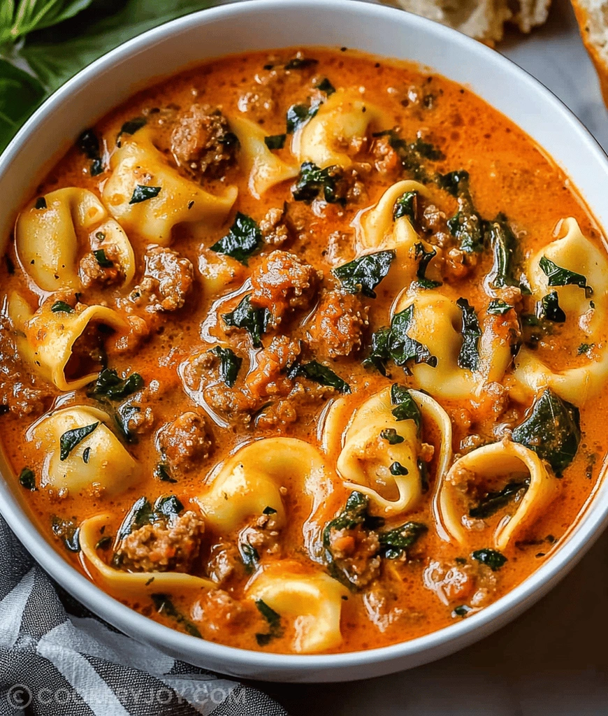 A hearty and comforting Creamy Sausage Tortellini Soup, packed with Italian sausage, cheese tortellini, and fresh spinach in a rich, savory broth.