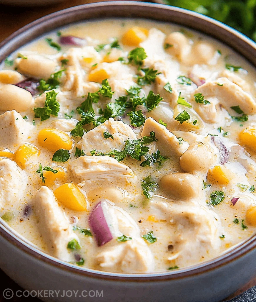 A hearty and flavorful creamy white chicken chili recipe, packed with tender chicken, white beans, corn, and a touch of spice.