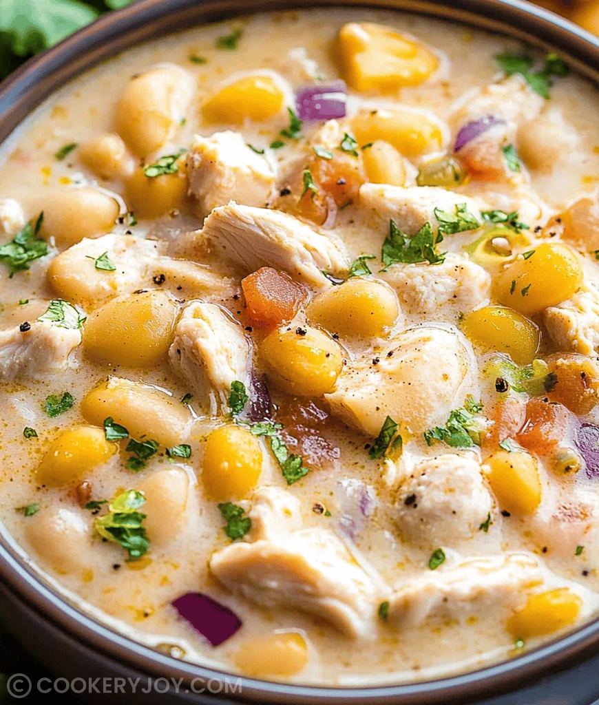 A hearty and flavorful creamy white chicken chili recipe, packed with tender chicken, white beans, corn, and a touch of spice.