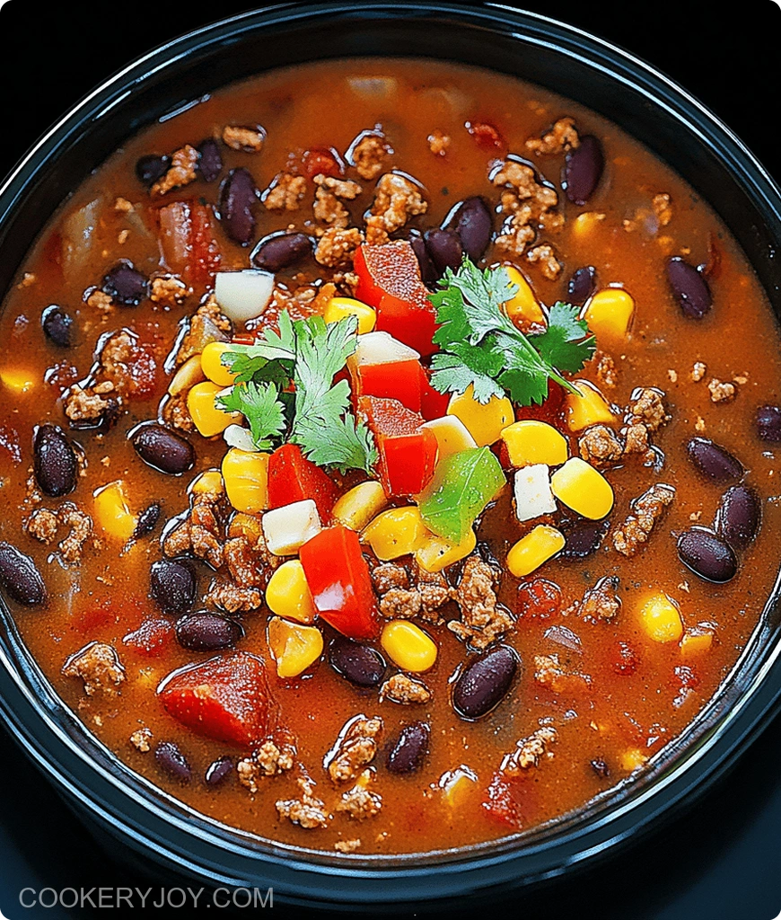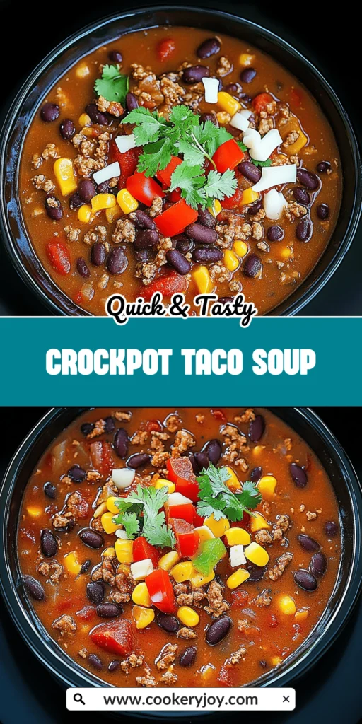 A hearty and flavorful crockpot taco soup made with ground beef, beans, corn, and tomatoes, seasoned with taco seasoning and beef broth.