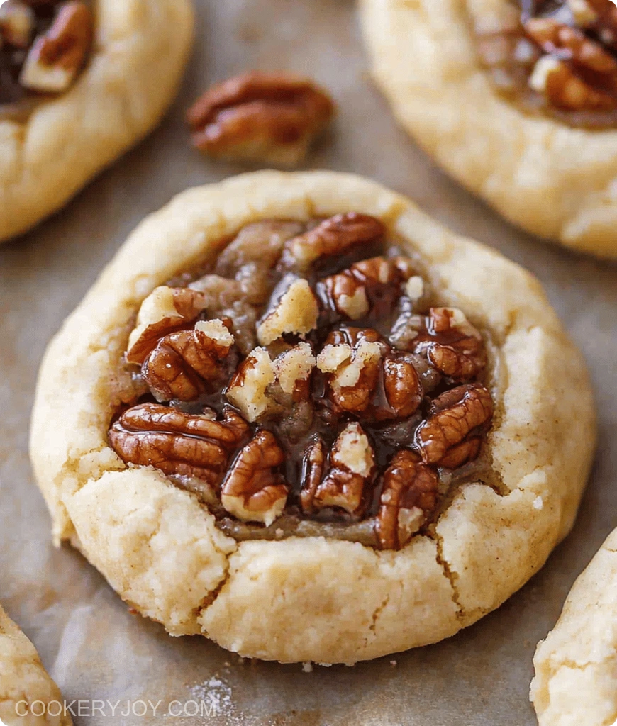 - Assembly: Once the cookies are baked and cooled slightly, spoon the pecan pie filling into the indentations of each cookie.
