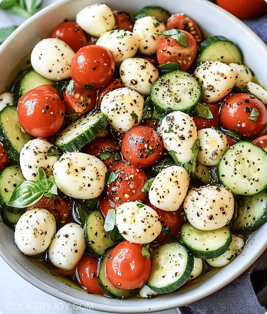 A refreshing and light twist on the classic Caprese salad, featuring crisp cucumbers alongside tomatoes, mozzarella, and basil.