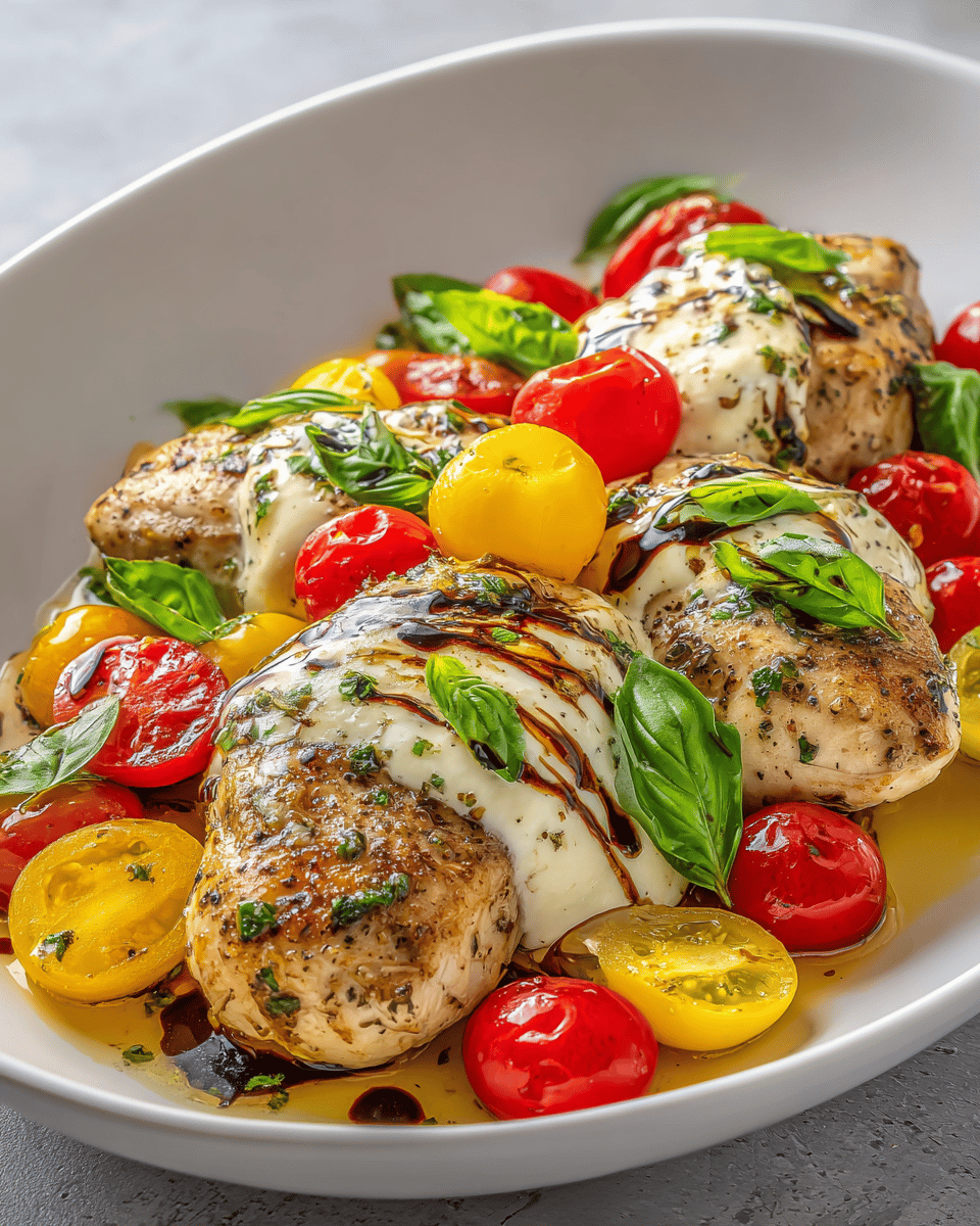 Easy Caprese Chicken is a simple oven-baked dish featuring tender chicken breasts coated in a balsamic-tomato mixture, topped with melted mozzarella cheese and fresh basil for a fresh Italian-inspired flavor.