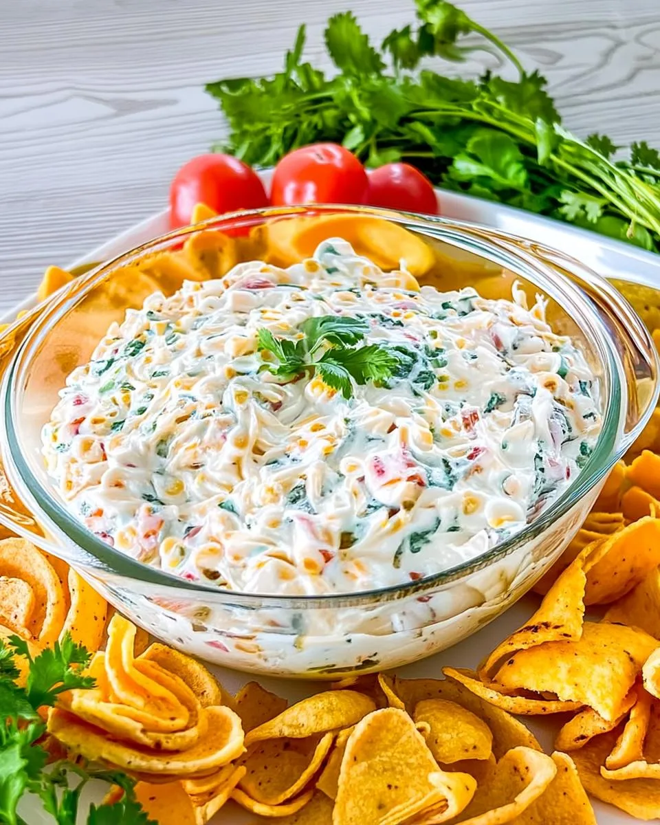 A creamy and flavorful corn dip made with sour cream, cheddar cheese, and fresh vegetables, perfect for serving with tortilla chips or veggies as an easy appetizer.