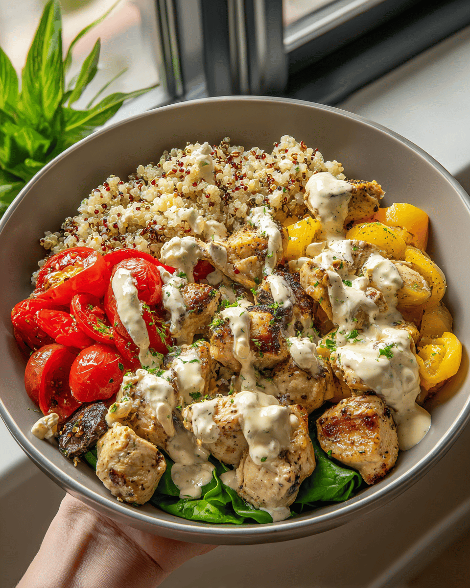 The ingredients in these Greek Chicken Bowls come together for a balanced, zesty profile where creamy yogurt and fresh herbs shine against tangy lemon and garlic. Opting for high-quality extra virgin olive oil and fresh produce enhances the authentic Mediterranean vibrancy without overpowering the dish.