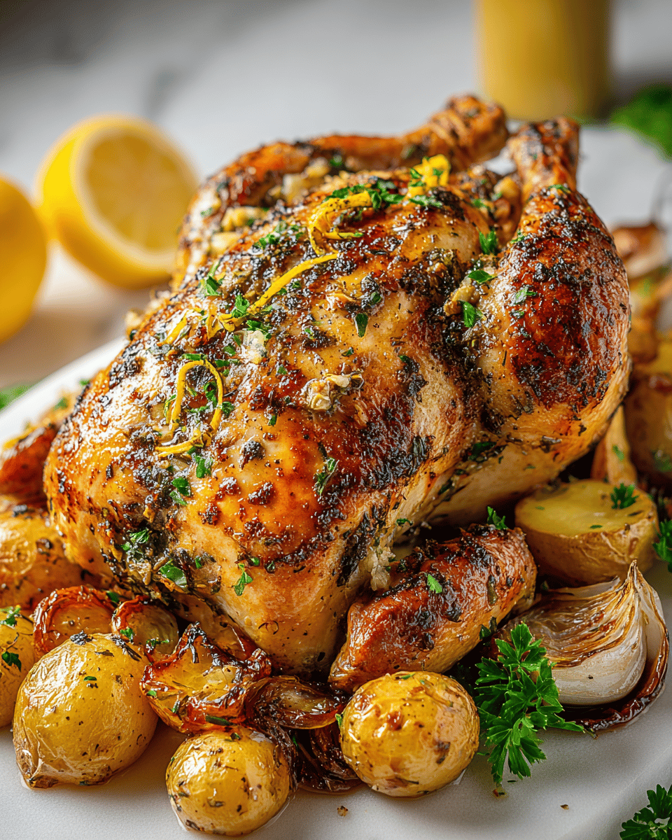 A simple and flavorful whole roasted chicken infused with fresh lemon, herbs like parsley and tarragon, and garlic, accompanied by roasted baby potatoes and onions for an easy, delicious meal.