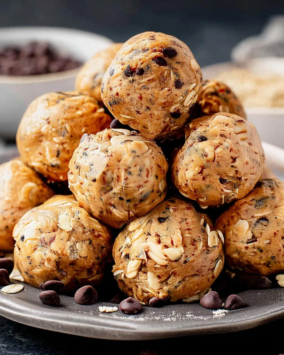Easy no-bake peanut butter protein balls made with natural ingredients like oats, flaxseed, and chocolate chips for a healthy, protein-packed snack.