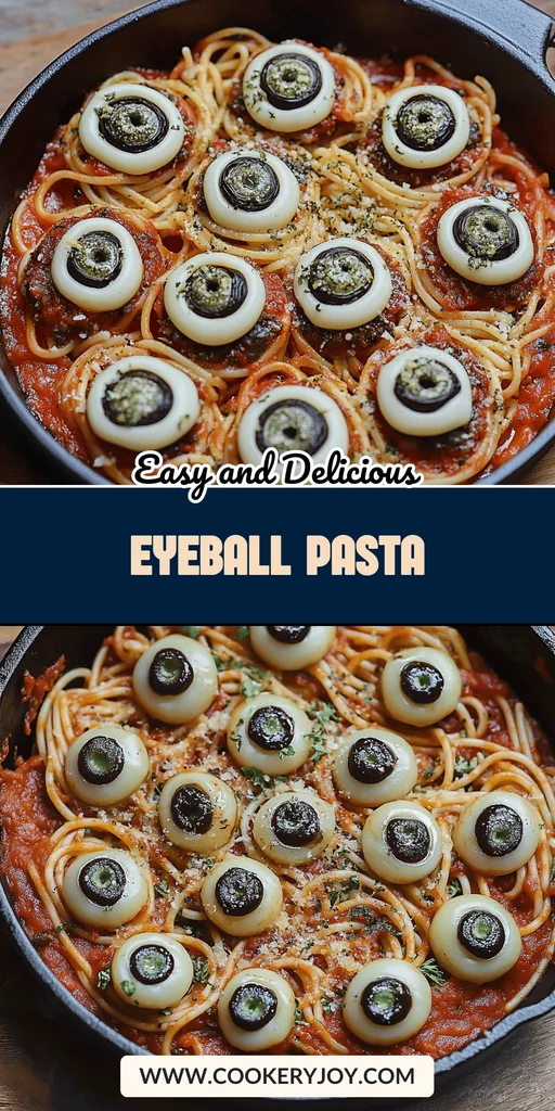 For a vegetarian Eyeball Pasta, substitute the ground beef with plant-based crumbles or extra mushrooms. You can also use pre-sliced black olives for convenience. For a brighter flavor, a splash of red wine can be added to the sauce while simmering. If you don’t have mozzarella balls, you can use larger mozzarella slices cut into rounds.