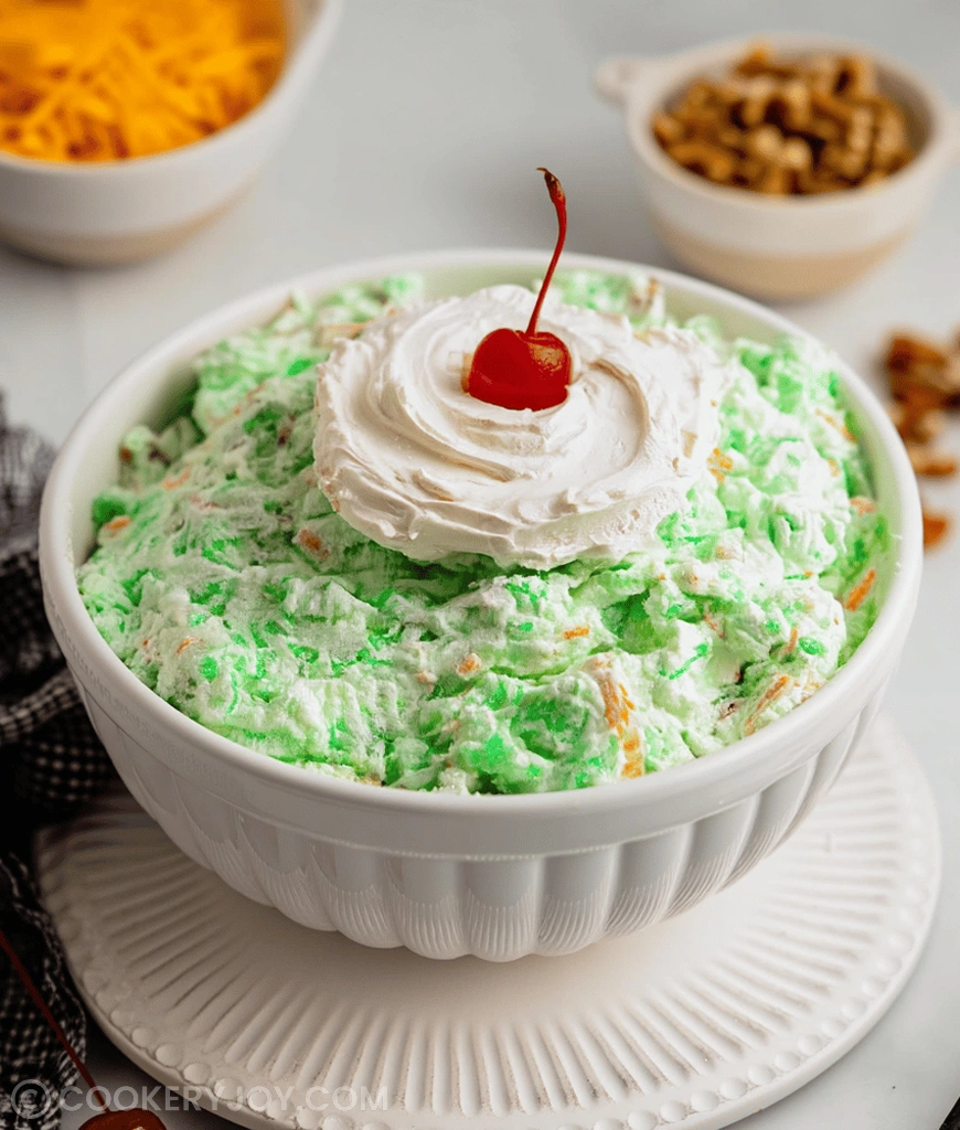 A classic and creamy dessert salad featuring lime gelatin, cream cheese, crushed pineapple, marshmallows, and optional nuts, topped with whipped topping.