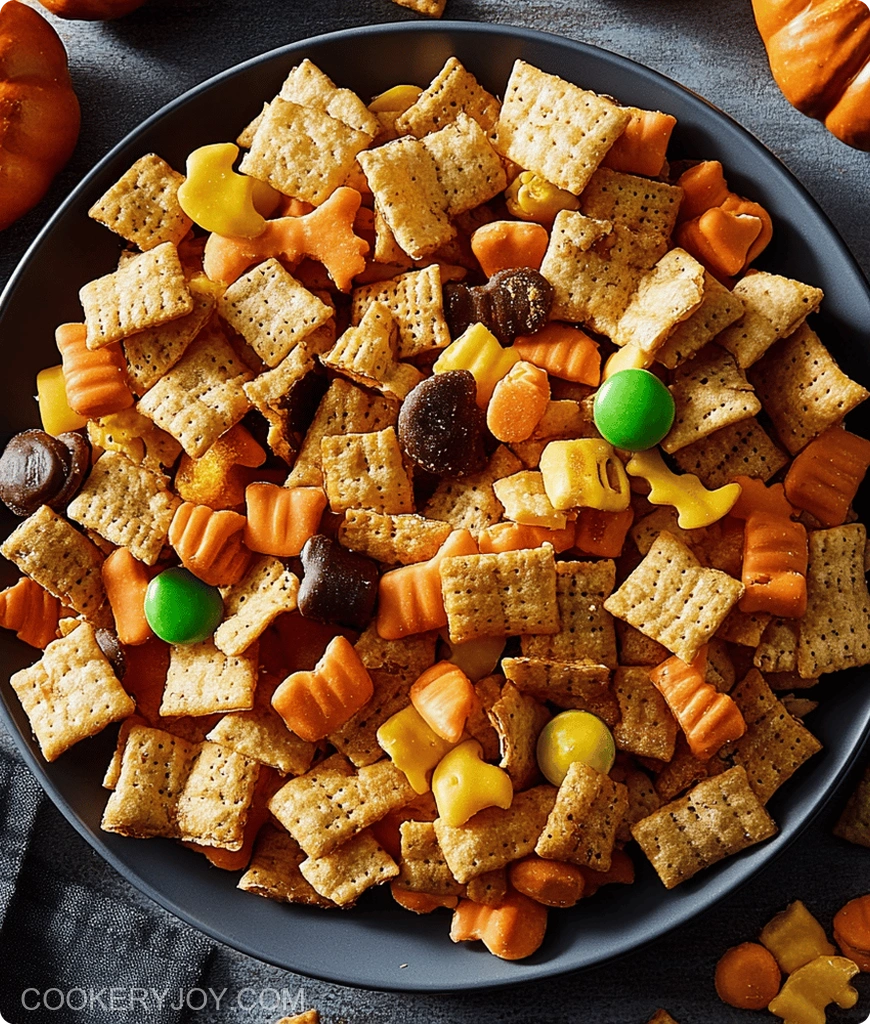 A festive and crunchy Halloween Chex Mix featuring a blend of cereals, pretzels, peanuts, and sweet candy corn, perfect for spooky gatherings.