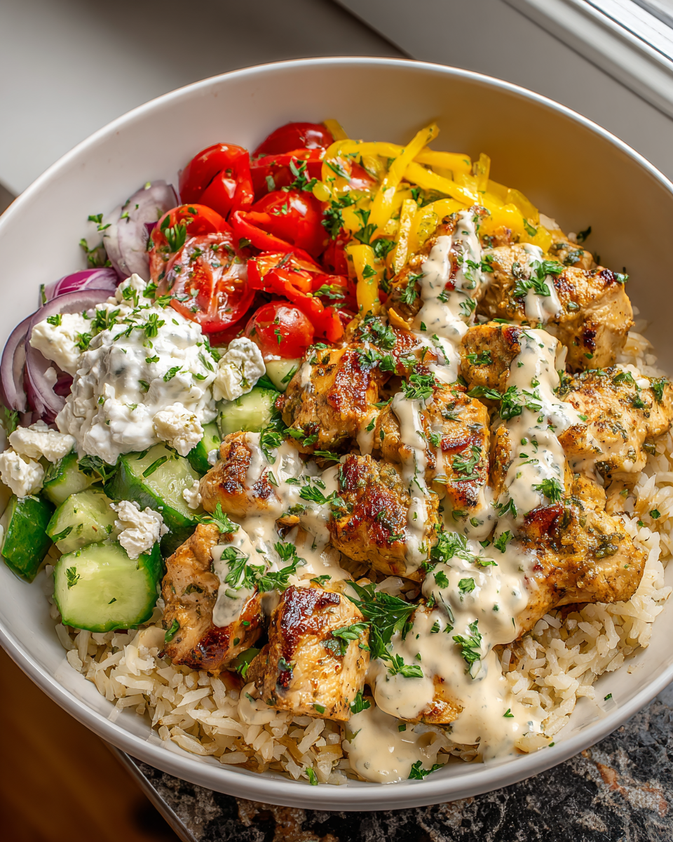 A healthy and flavorful Mediterranean Chicken Bowl featuring marinated grilled chicken, fresh vegetables, feta cheese, and homemade tzatziki sauce served over rice or quinoa.