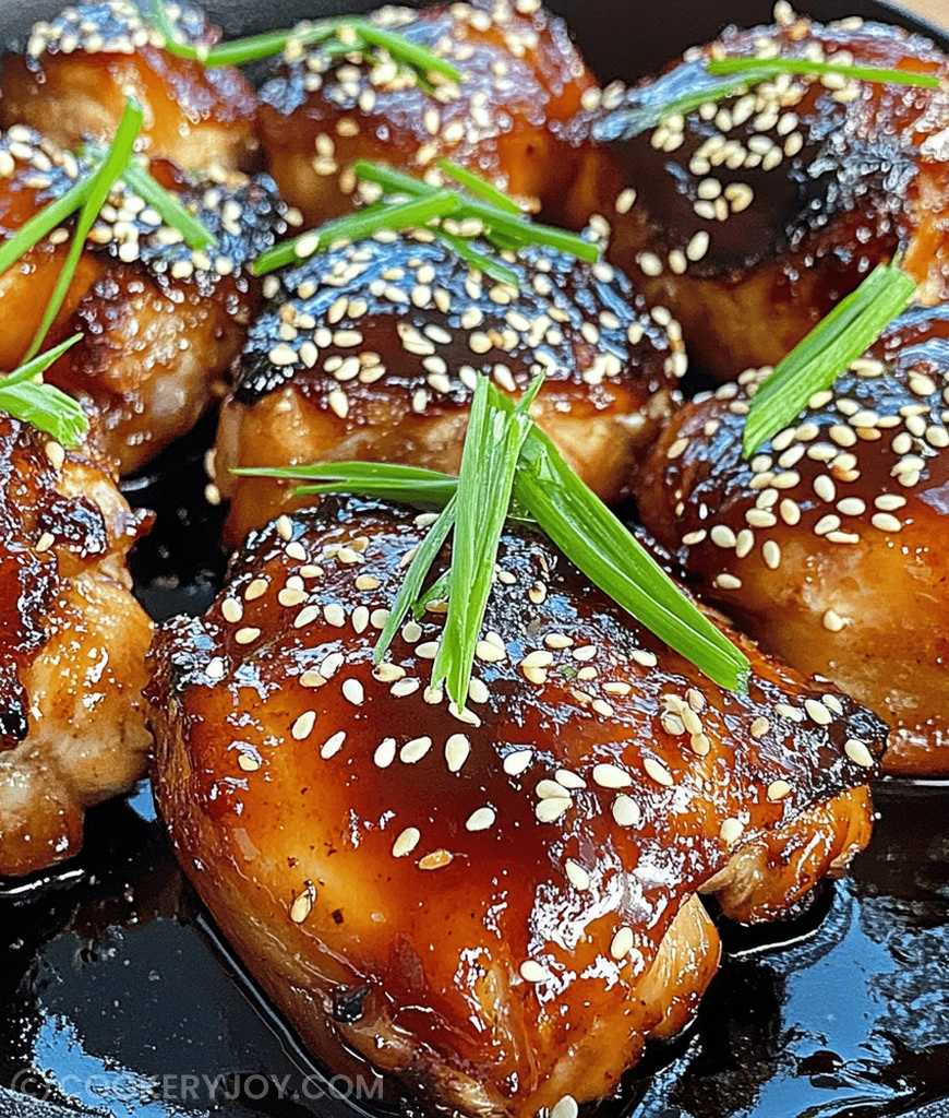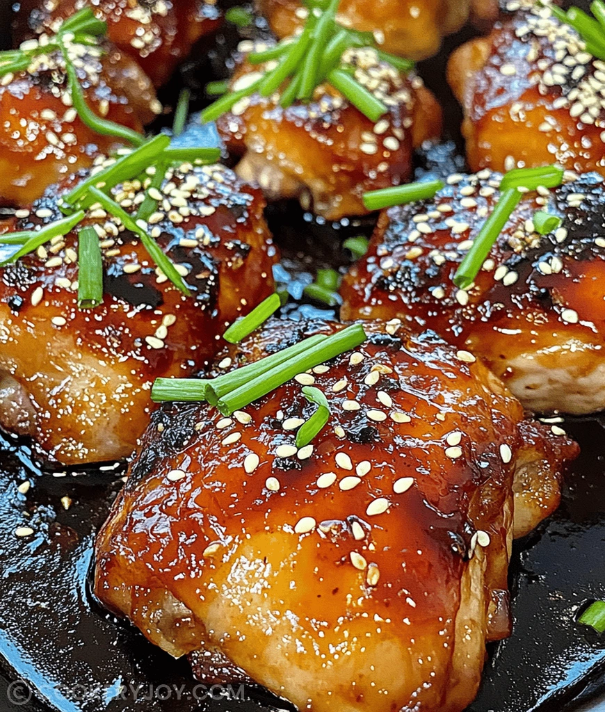 - Slice chicken thighs or serve whole. Drizzle with any extra sauce from the pan. Garnish with sesame seeds and sliced green onions, if desired.