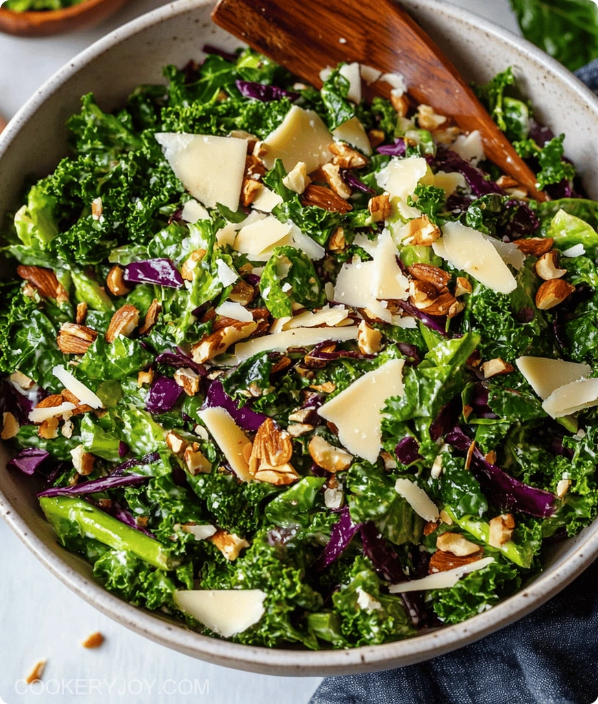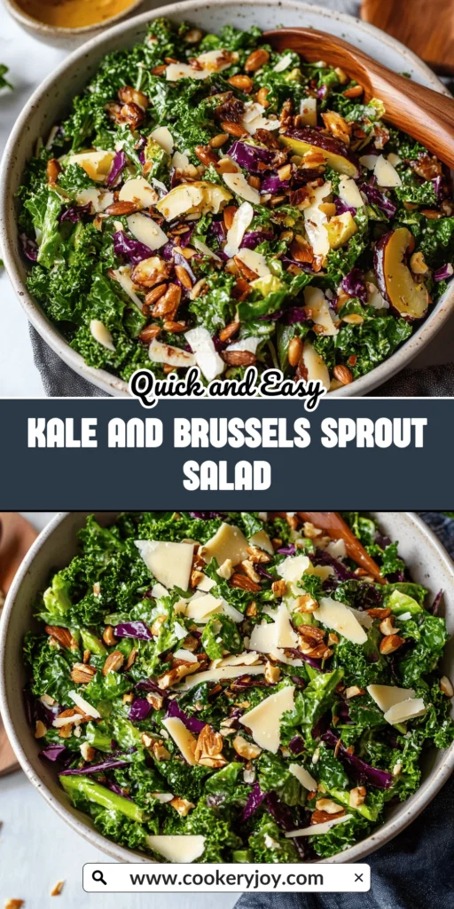 A vibrant and flavorful salad featuring shredded Brussels sprouts and kale, tossed in a tangy lemon-Dijon dressing with toasted walnuts and Parmesan cheese.