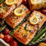A simple and flavorful Lemon Garlic Salmon Tray Bake featuring salmon fillets, asparagus, and cherry tomatoes, all roasted together on one pan for an easy weeknight meal.