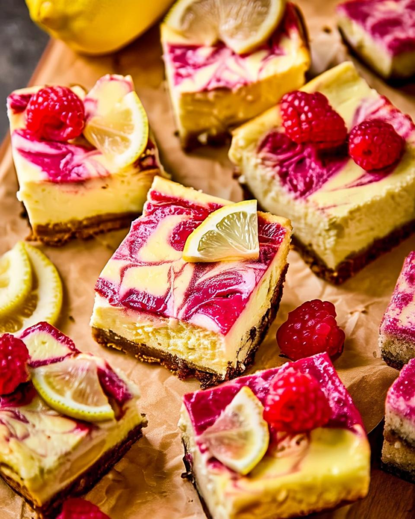 High-protein cheesecake bars featuring a tangy lemon filling swirled with raspberry puree on a graham cracker crust, perfect for a healthy dessert.