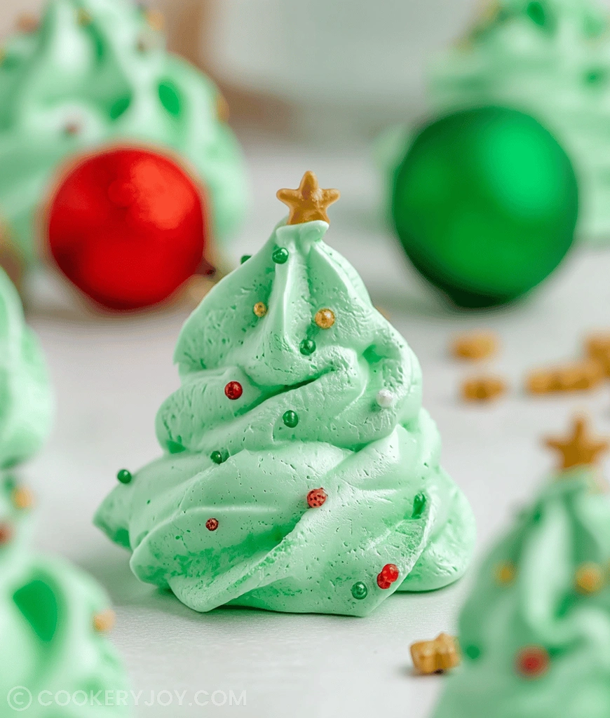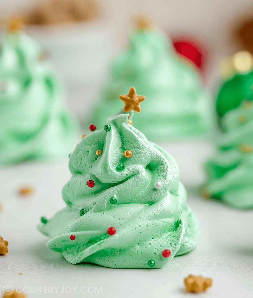 You must decorate right away, friends. Before the meringue sets up too much, add your sprinkles. Press on small edible pearls or star sprinkles. Think of these as tiny, colorful ornaments adorning your little trees.