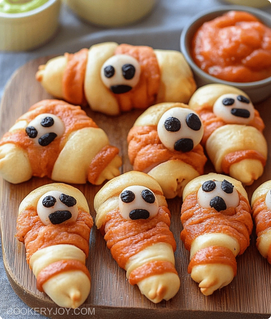 Mummy Hot Dogs are a fun and spooky Halloween-themed treat made by wrapping hot dogs in crescent roll dough to look like mummies.