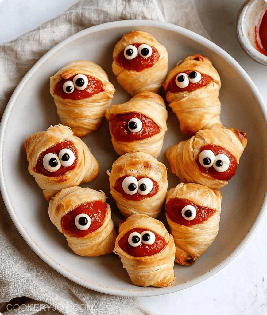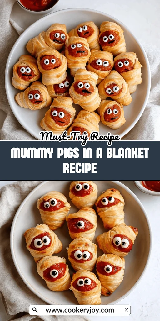 A fun and spooky Halloween treat, these Mummy Pigs in a Blanket are made with crescent rolls and hot dogs, perfect for parties or a festive snack.