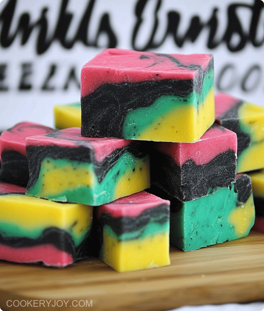 A festive and visually striking fudge inspired by the iconic character Sally from Tim Burton’s ‘The Nightmare Before Christmas’, featuring a marbled patchwork of vibrant colors.