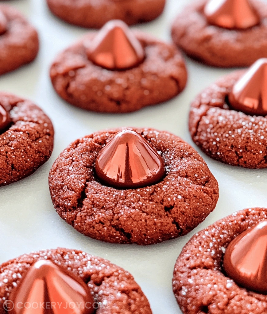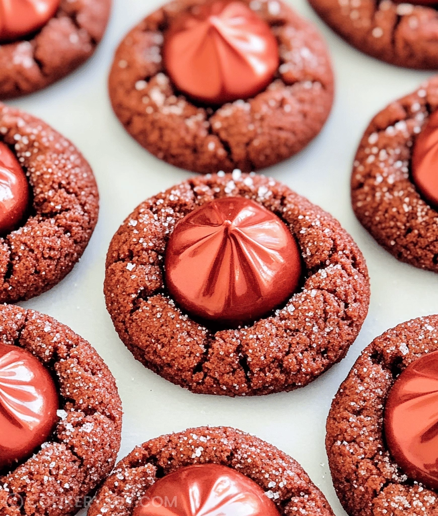 A festive and visually appealing cookie, Red Velvet Blossom Cookies combine the classic flavor of red velvet cake with the beloved peanut butter blossom cookie format, featuring a chocolate kiss center.