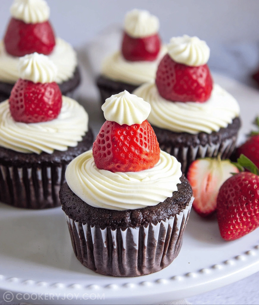 A festive and easy-to-make dessert featuring vanilla or chocolate cupcakes topped with buttercream frosting and fresh strawberries arranged to look like Santa hats.
