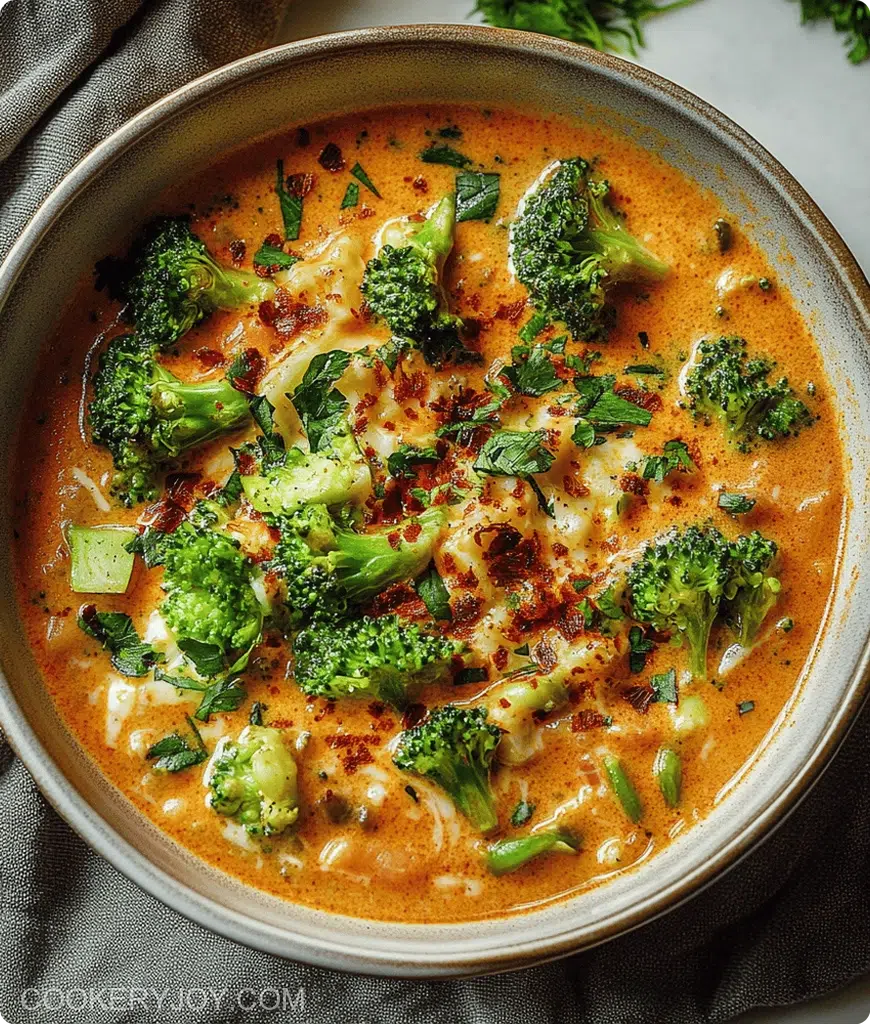A creamy and flavorful soup with a spicy kick, featuring tender broccoli and sharp cheddar cheese.