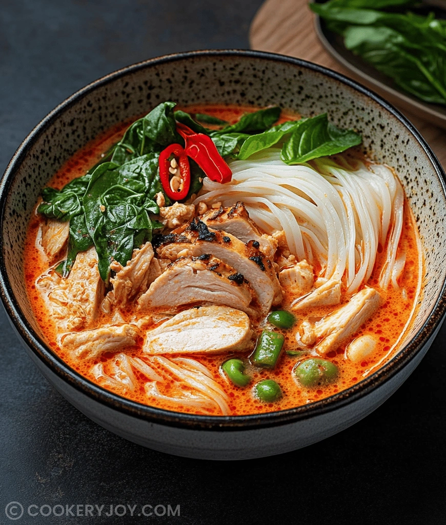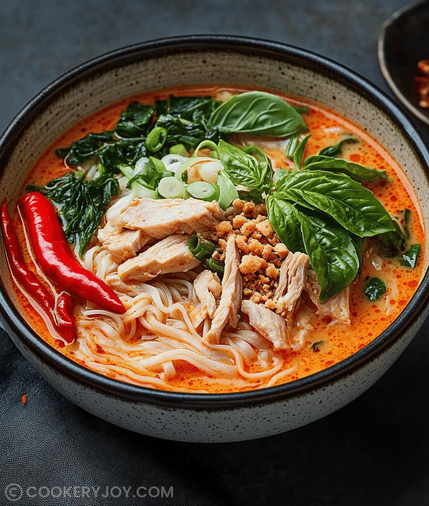 A flavorful and aromatic Thai Red Curry Noodle Soup, featuring tender chicken, crisp vegetables, and a rich, spicy coconut broth served over noodles.