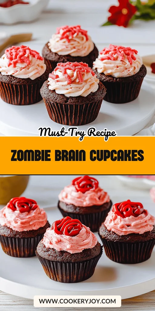 A spooky and fun recipe for Zombie Brain Cupcakes, perfect for Halloween or any themed party. These cupcakes feature a rich chocolate cake base and are topped with a vibrant green buttercream frosting shaped to resemble a brain, complete with a bloody drizzle.